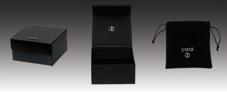 Produced by world leading manufacturers of designer packaging products, Trends Design packaging is made up from three high quality independent components. The outer box is made from a heavy grade material covered with black non shiny Satin and silk screened with our Trends Design logo. The inside of our box includes a black non shiny Velvet pouch with our logo silk screened on both sides. And finally, our Pouch lays on a velvet covered foam that provides protection and a great look.